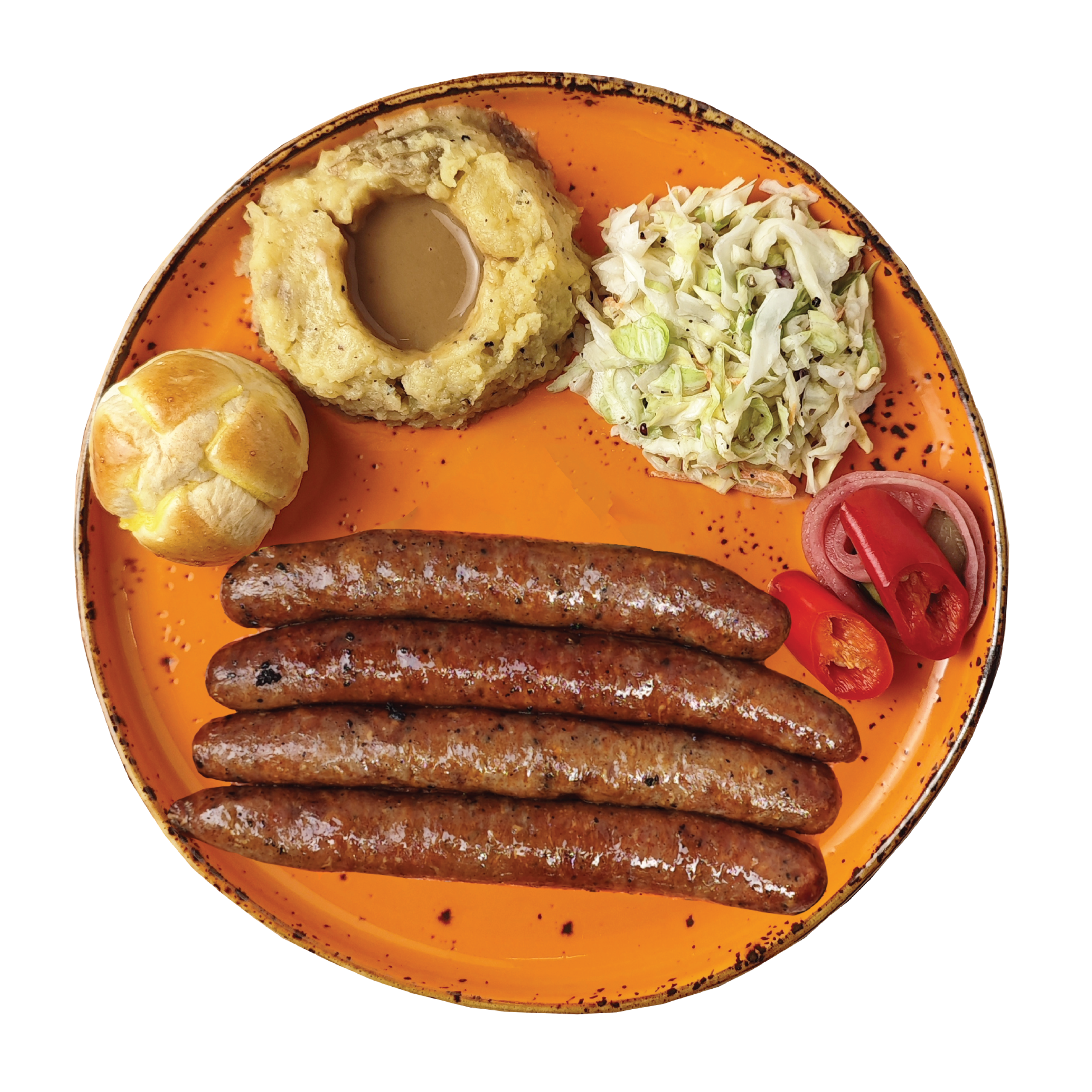 4 Pieces Sausages, Mashed Brotatoes, Slaw, Brotato Bun.